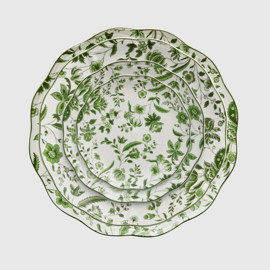 A soft, botanical print in layered greens that feels equal parts classic and alive, bringing a sense of movement and freshness to the table.