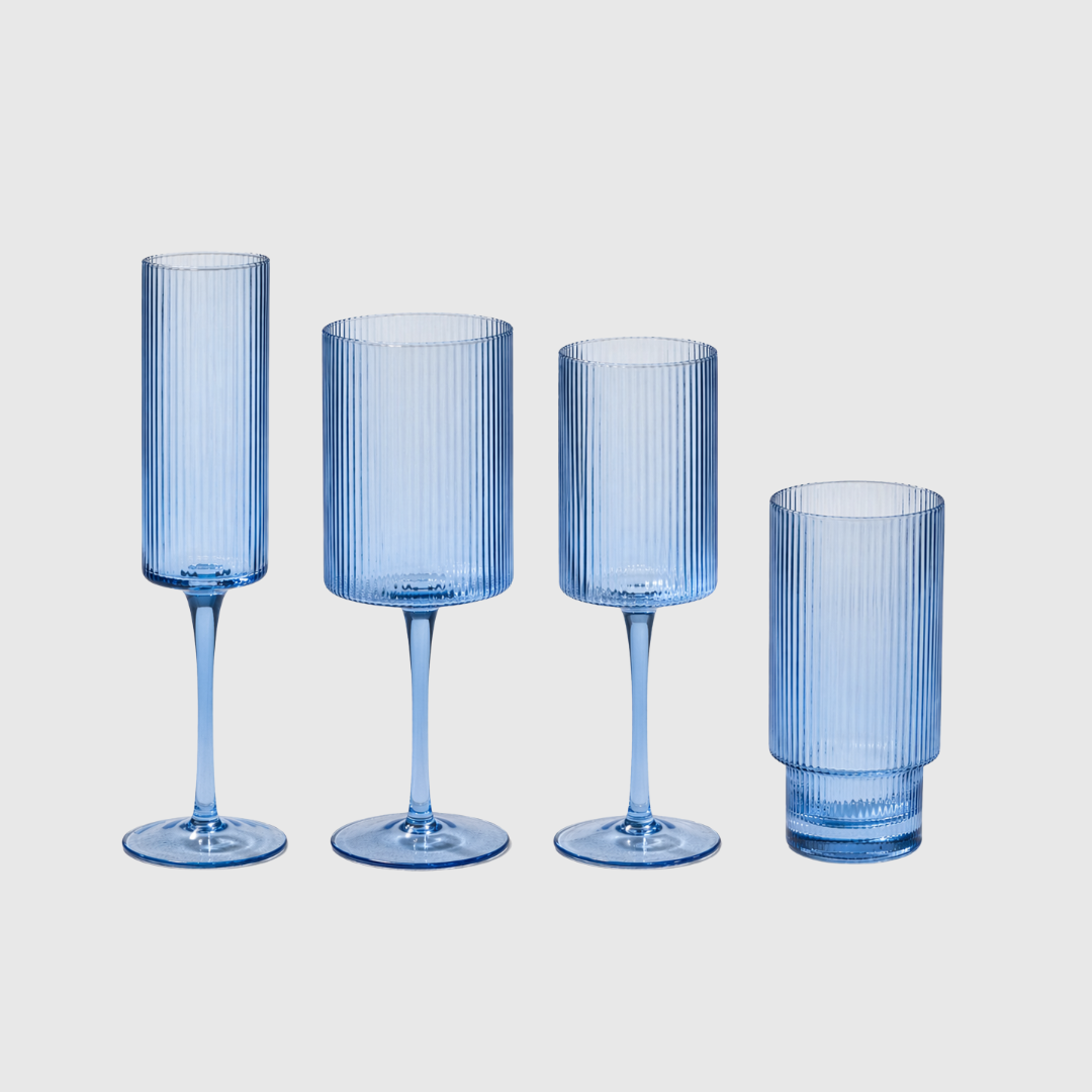 A refined set of ribbed glassware in a cool, ocean-tinted blue that catches the light with crisp clarity and subtle depth.