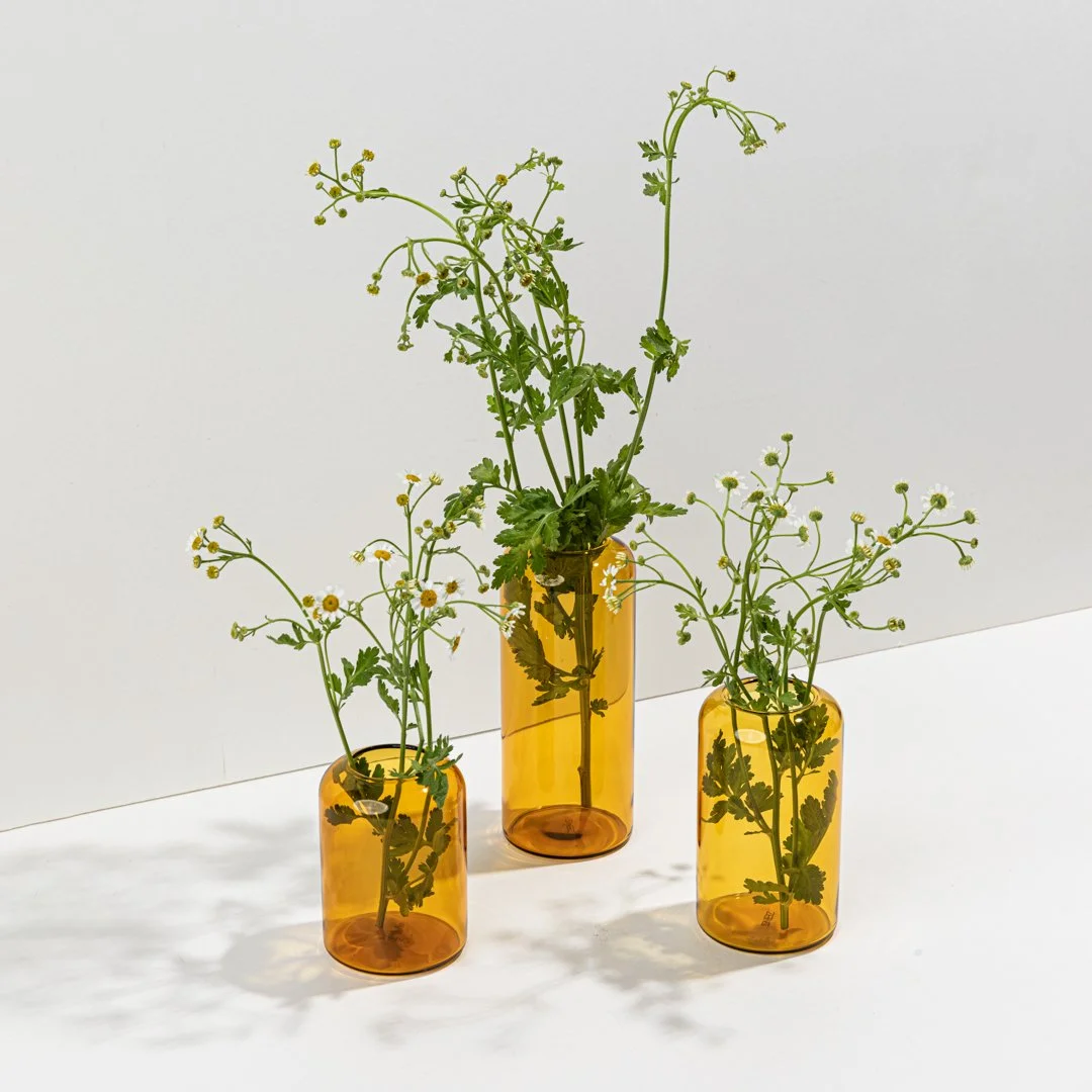 Tara Amber VasesModern amber bud vases in three sizes. A variation of sizes will be included in your order. Rented in quantities of 3. $6 / Three Bud Vases